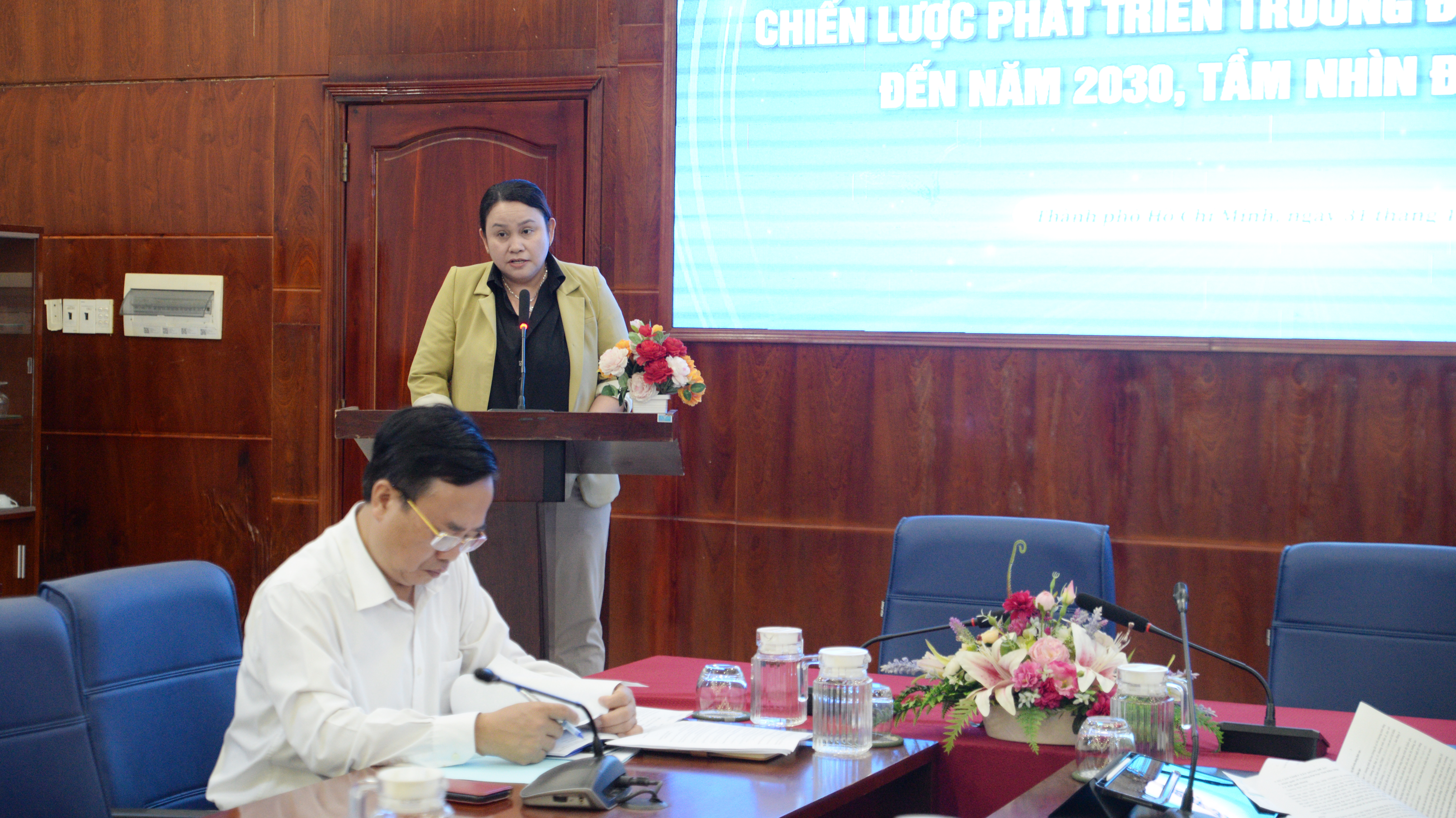 M.A. Tran Thi Kim Ngoc – Head of the Department of Organisation and Personnel, representing the Group for reviewing and adjusting the University's development strategy, reported briefly on the implementation process.
