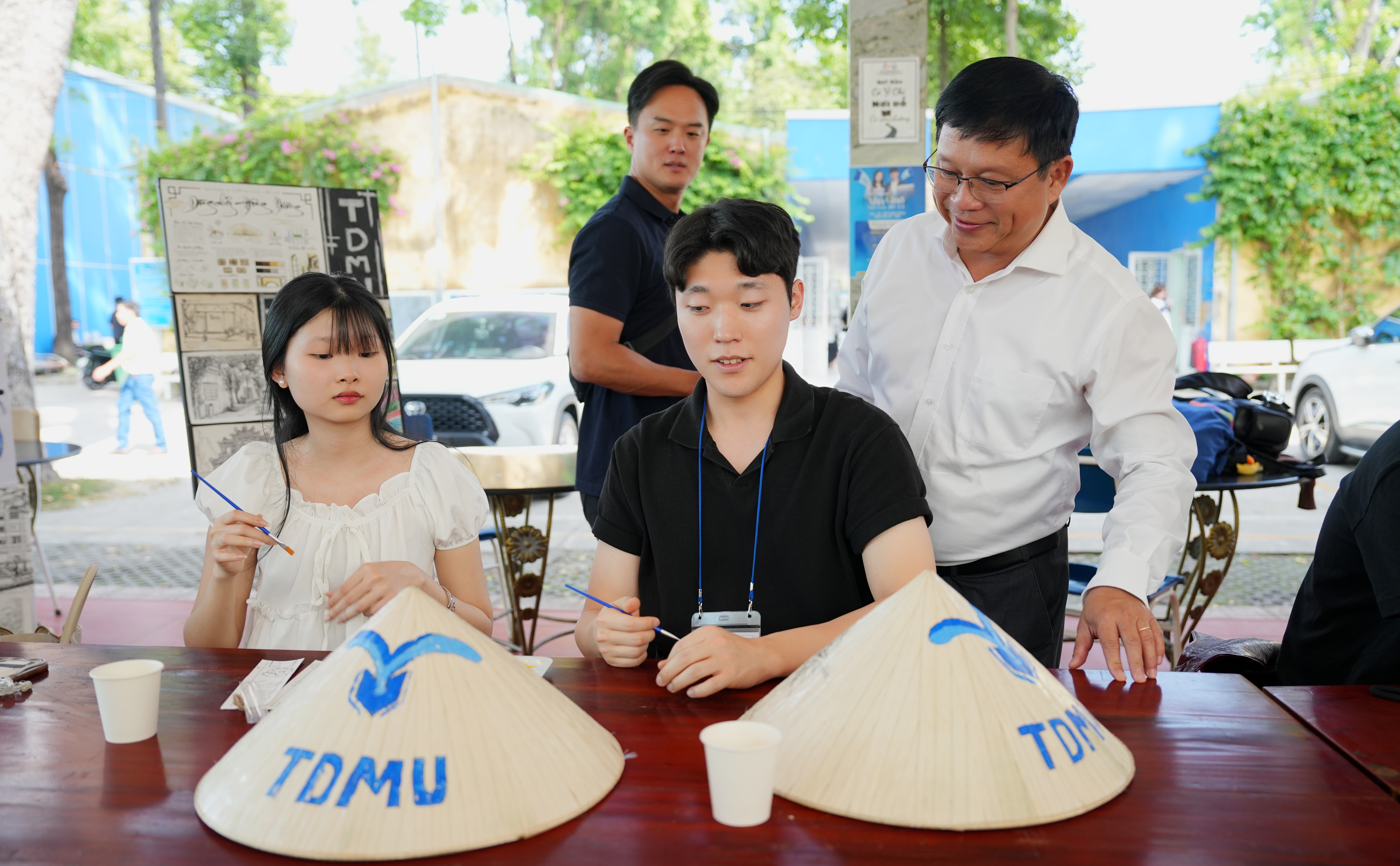 In his welcoming remarks, Assoc. Prof. Dr. Ngo Hong Diep – Vice President of Thu Dau Mot University, noted that Ho Chi Minh City and Busan City officially established a sister-city relationship in 1995, and the year 2025 marked the 30th anniversary of the friendly cooperative relationship between the two localities. Over the past three decades, cooperation between Ho Chi Minh City and Busan has been continuously strengthened and expanded across various fields, particularly in education, culture, and people-to-people exchanges. Student exchange programs, educational cooperation, and scientific research collaboration have played an important role in enhancing mutual understanding, building trust, and laying a solid foundation for sustainable cooperation between the two cities. “We are delighted to welcome students from universities in Yeongdo District, Busan City to visit and engage in exchange activities at Thu Dau Mot University through a series of diverse programs such as cultural and artistic performances, cultural experiences, and especially the activity of painting and decorating traditional Vietnamese conical hats (nón lá)—a distinctive symbol of Vietnam’s traditional culture. These activities will offer students many memorable experiences and, in doing so, further deepen the friendship between Ho Chi Minh City and Busan City,” - Assoc. Prof. Dr. Ngo Hong Diep expressed.