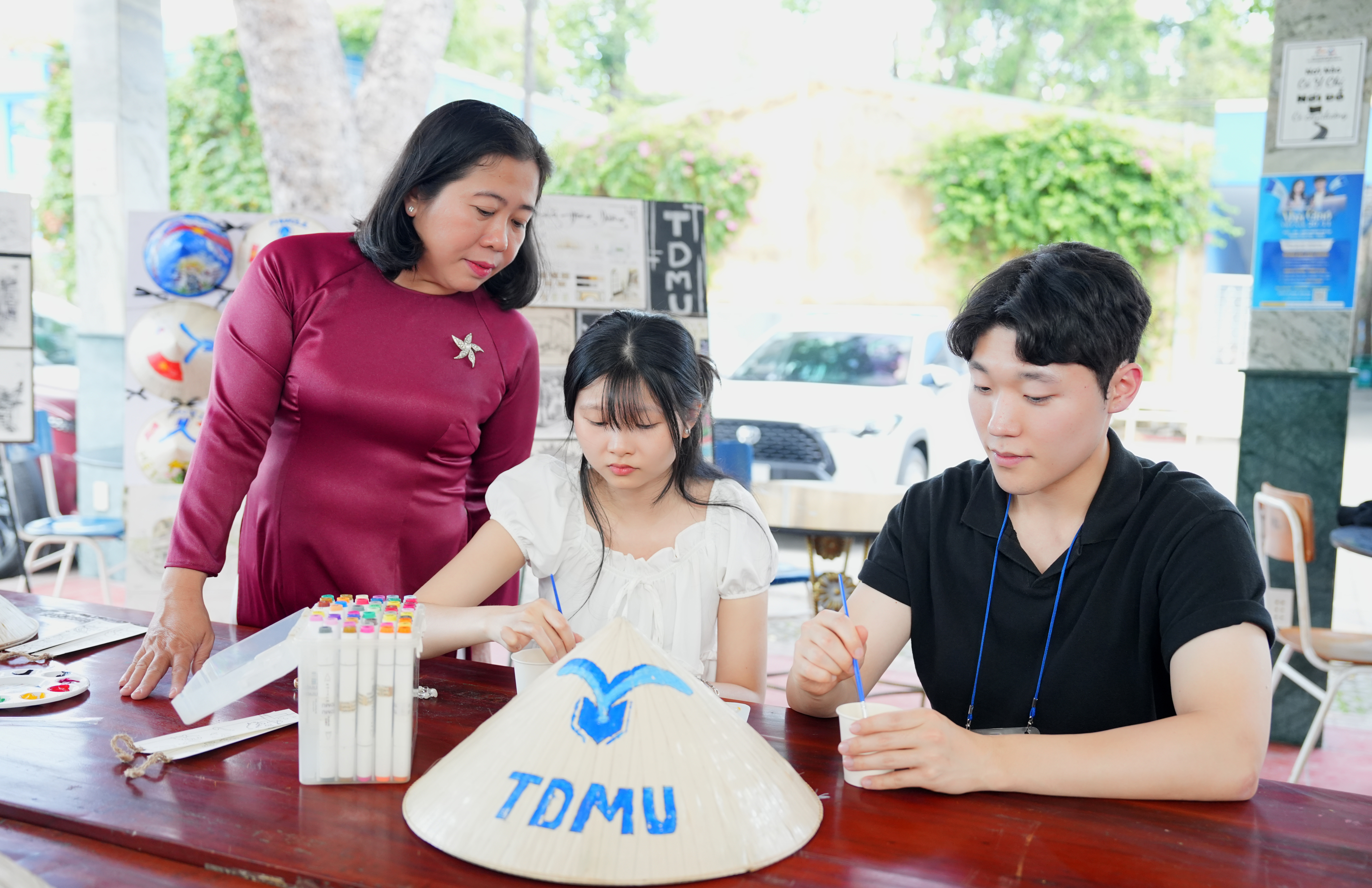 Students of Thu Dau Mot University, together with Korean students, experienced painting traditional Vietnamese conical hats (nón lá).